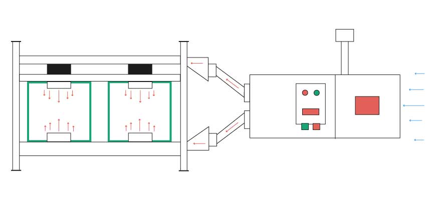 I moduli (AT-BL-2) possono essere montati sovrapposti oppure su unico piano secondo lo spazio disponibile in azienda o la comodità dell'operatore, infatti, l'aria calda e secca prodotta dal generatore (GCO) può essere facilmente convogliata in qualsiasi direzione grazie a speciali maniche flessibili ed antistatiche. Le dimensioni e la portata del generatore d'aria secca vengono correttamente adeguate al numero di moduli installati, esso funziona in modo completamente automatico dopo aver impostato gli appositi strumenti digitali che hanno la funzione di mantenere costanti temperatura ed umidità dell'aria utilizzata per il trattamento ottimale del foraggio. La giusta collocazione delle sonde che gestiscono il sistema ci garantisce un trattamento pressochè perfetto del prodotto. I moduli (AT-BL-2) in acciaio zincato a caldo sono stati concepiti per contenere due rotoballe e si presentano molto robusti agli eventuali urti di trattori nelle fasi di caricamento della macchina. Essi contengono i canali dell'aria che sono indipendenti dalla struttura portante e ogni modulo è dotato di quattro cilindri pneumatici a doppio effetto che consentono il sollevamento e l'abbassamento del piano mobile permettedo il caricamento e la successiva chiusura ermetica delle rotoballe di fieno umido da trattare. Completate le operazioni di carico si comincia l'immissione d'aria nella rotoballa da sopra e sotto obbligandola a passare attraverso il fieno garantendoci un rapido e perfetto trattamento dei foraggi. I moduli sono inoltre dotati di serrande che ci permettono di convogliare l'aria nella direzione desiderata e quindi la possibilità di escludere una parte di macchina oppure di trattare il ballone solo dal basso per qualche minuto (sistema a platea) qualora il prodotto sia in fase fermentativa.
